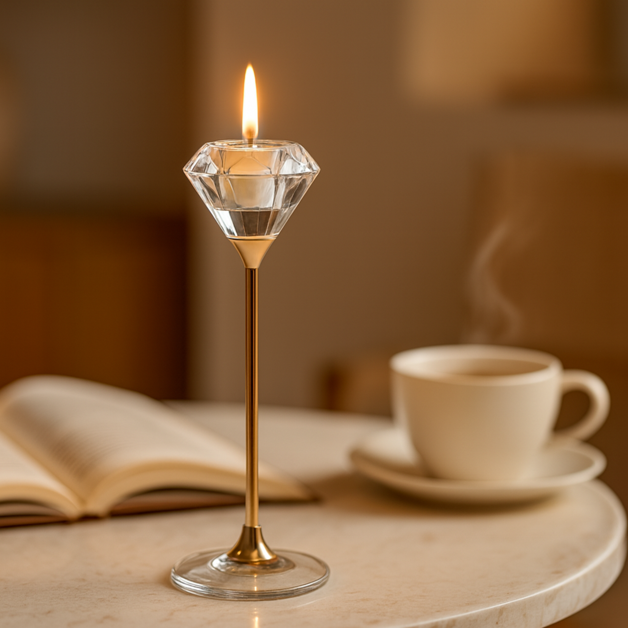 Ce trio de bougeoirs en cristal facetté forme un halo chaleureux et raffiné. La coupe « diamant » magnifie la flamme, la tige dorée élancée allonge la silhouette, et la base en verre assure une stabilité impeccable — parfait pour un dîner, une réception, un mariage ou une déco de salon haut de gamme en Tunisie.
