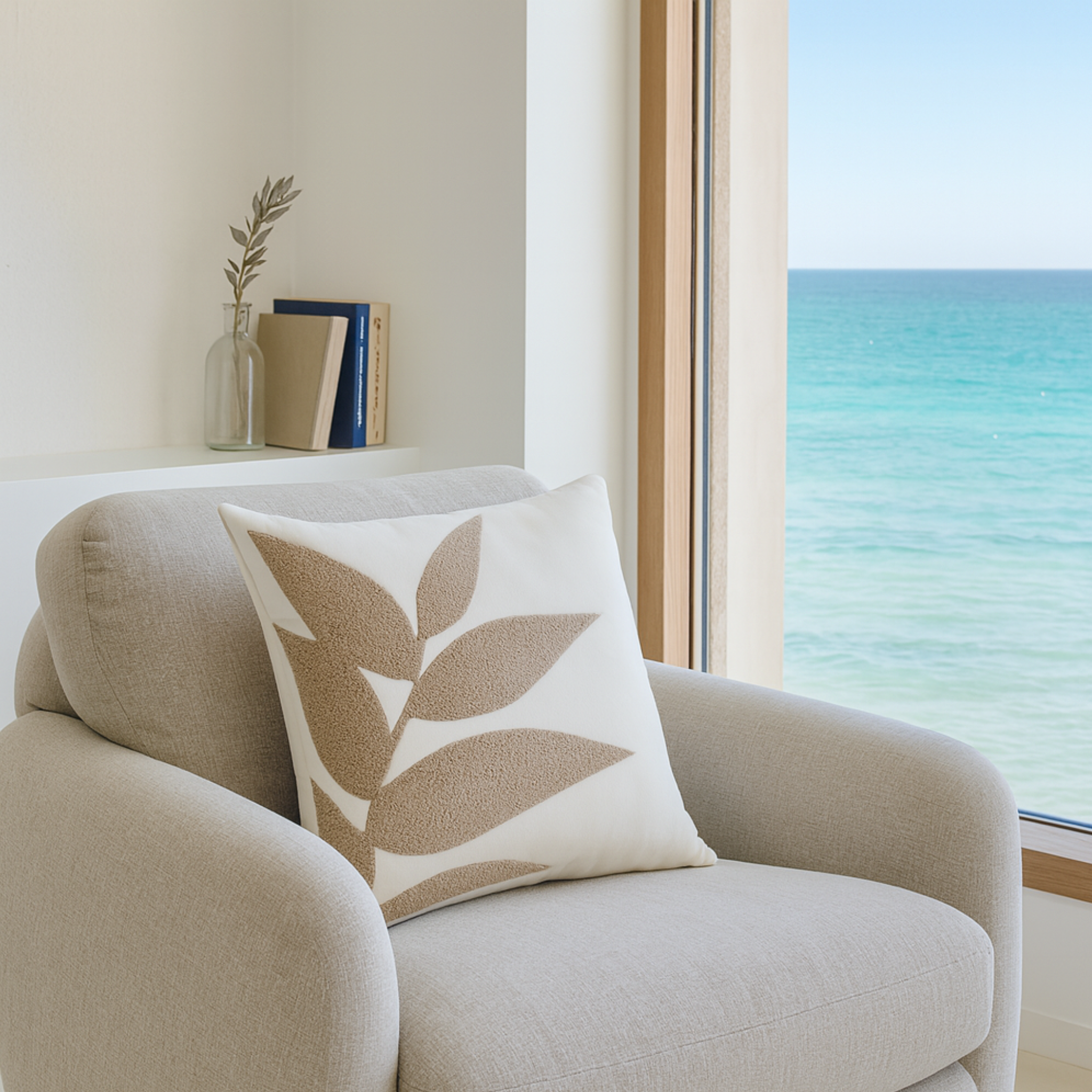 Apportez douceur et naturel à votre déco avec ce coussin décoratif motif feuille beige. Sa palette sable/écru crée une ambiance apaisante et élégante, parfaite pour canapé, fauteuil ou chambre bord de mer.