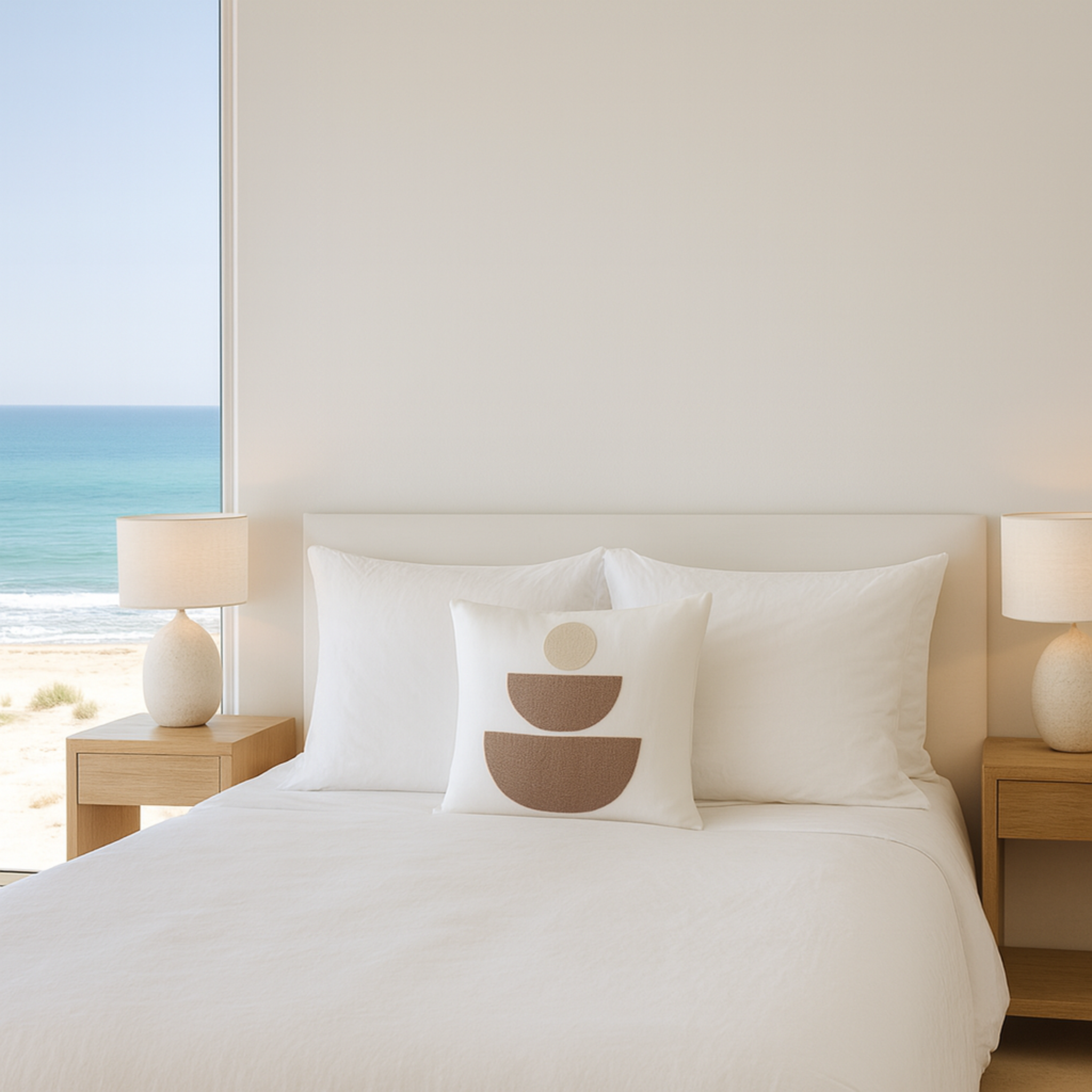 Apportez une touche zen et contemporaine à la chambre ou au salon avec ce coussin géométrique beige. Son motif totem minimal (demi-lunes + soleil) sur fond écru crée un contraste doux qui se marie parfaitement aux intérieurs clairs, bois naturels et linge de maison en lin.