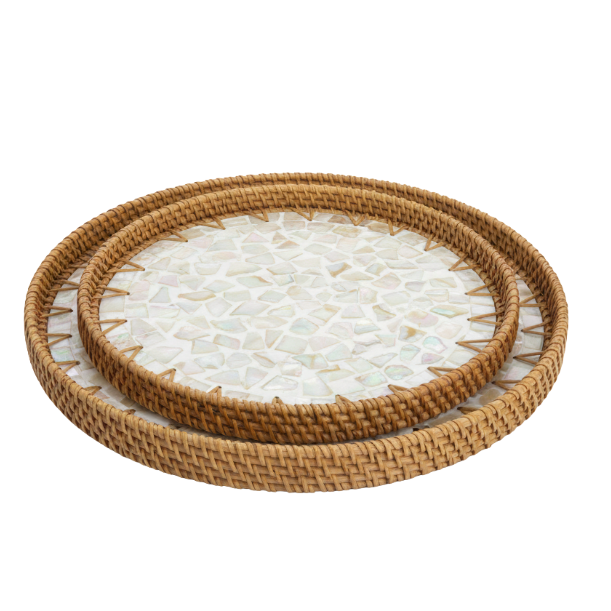 Série de 2 plateaux ronds en rotin & nacre – service & déco
