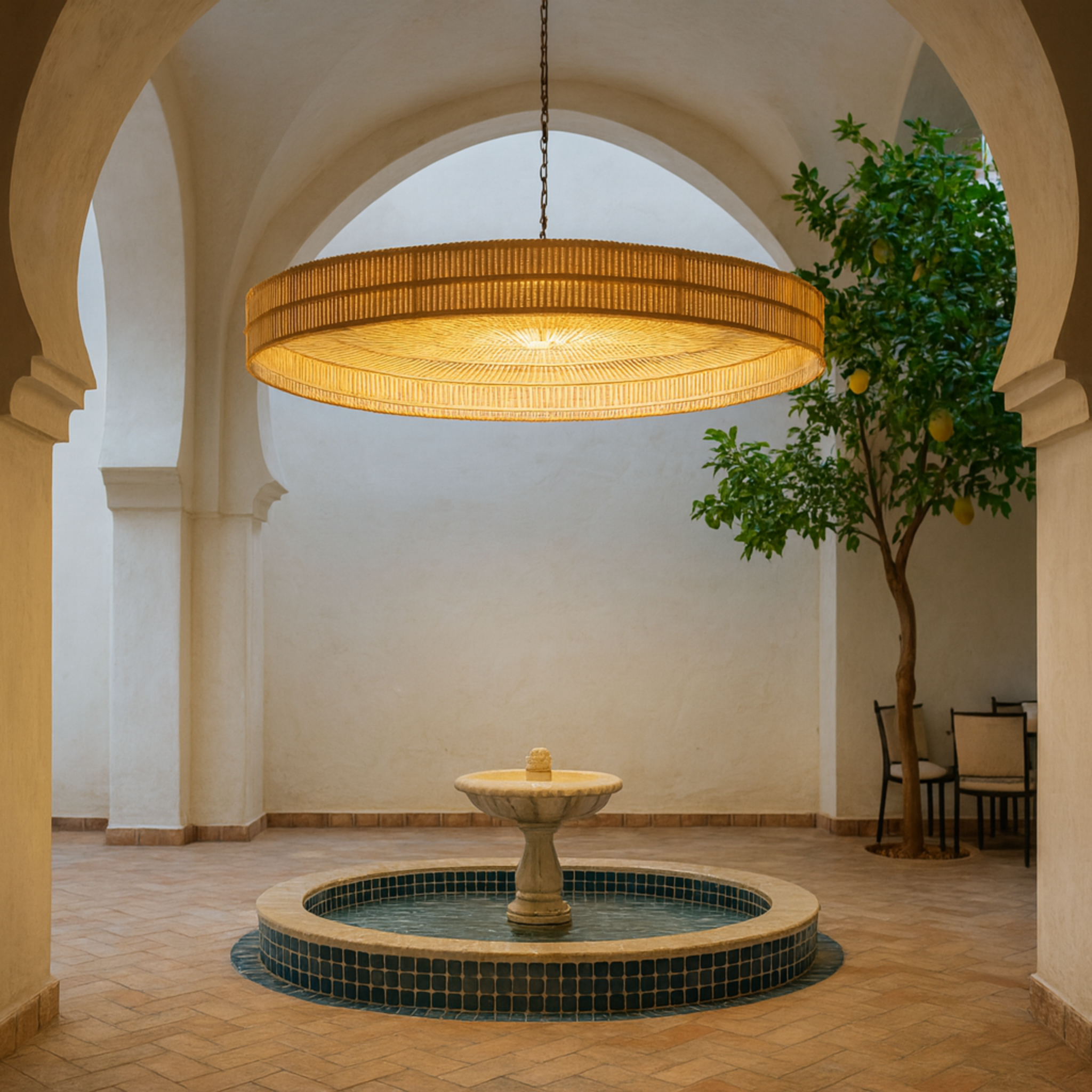 Légère et graphique, cette suspension en dattier au profil disque répand un halo ample et chaleureux au-dessus de la table. Le tressage en fibre de palmier dattier filtre la lumière avec douceur, tandis que la chaîne et la canopée en métal offrent une finition nette, durable et contemporaine. Naturelle et élégante, elle s’accorde aux bois clairs, au travertin et aux lins pour une atmosphère méditerranéenne chic.