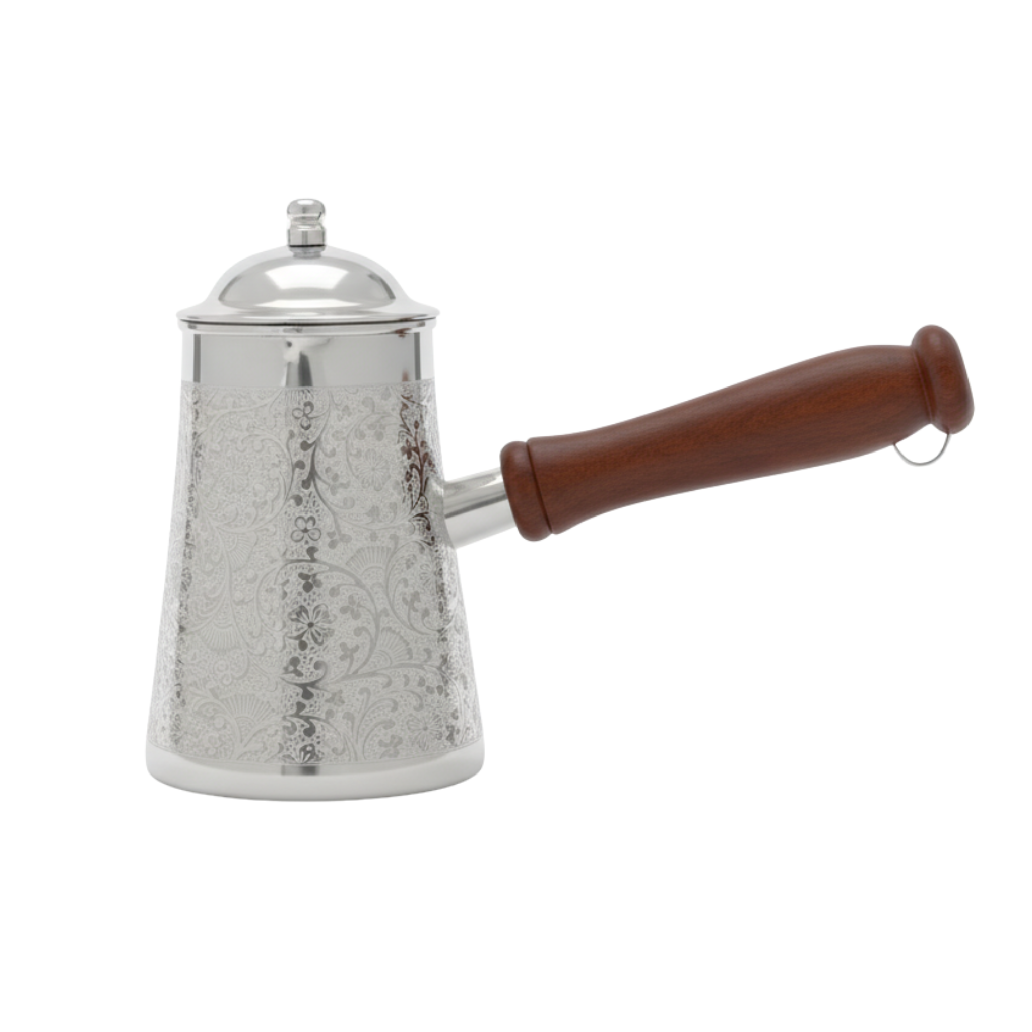 Découvrez cette magnifique zazoua en cuivre indien finition argentée, décorée de motifs gravés raffinés. Avec son manche en bois solide et son couvercle pratique, elle est idéale pour préparer un café turc, un thé parfumé ou même du lait chaud avec élégance.